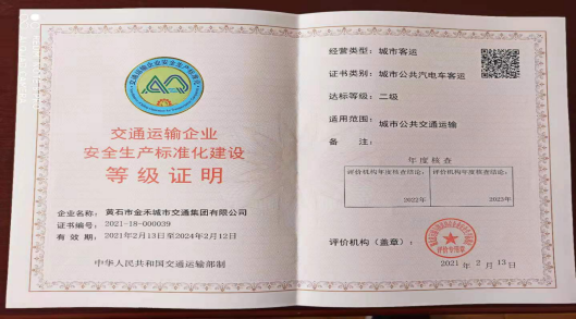 2021年新年伊始,湖北省運(yùn)輸與物流協(xié)會對黃石市金禾城市公交集團(tuán)有限公司安全生產(chǎn)標(biāo)準(zhǔn)化15個方面的工作進(jìn)行了實(shí)地考評。通過考評,金禾公司實(shí)現(xiàn)二級達(dá)標(biāo),榮獲《交通運(yùn)輸企業(yè)安全生產(chǎn)標(biāo)準(zhǔn)化建設(shè)等級證明》。