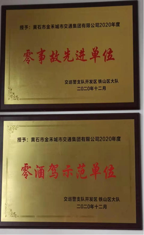 交巡警支隊開發(fā)區(qū) 鐵山區(qū)大隊授予的2020年度零事故先進(jìn)單位、零酒駕示范單位