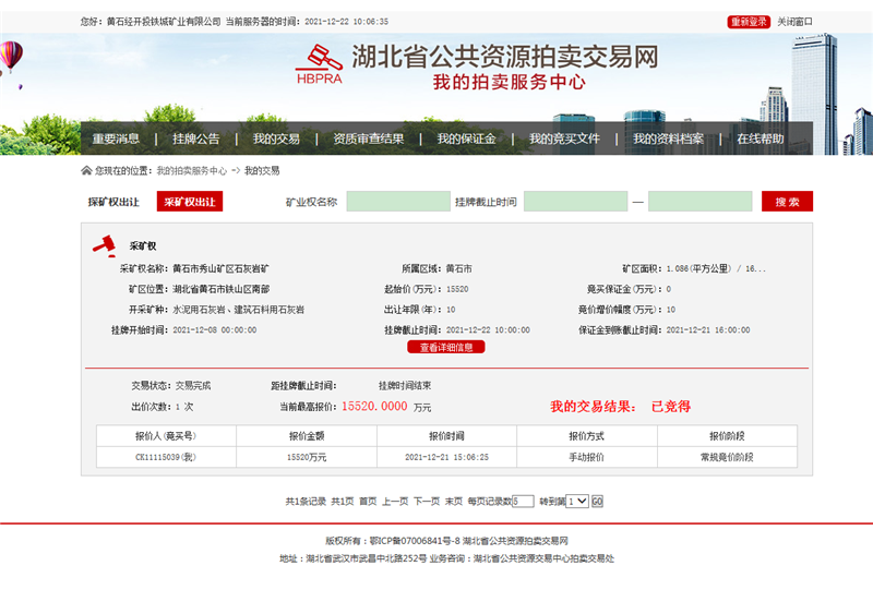 這是歷史性的時刻!12月22日上午10時許,黃石經(jīng)開投鐵城礦業(yè)有限公司以15520萬元的成交價競得黃石市秀山礦區(qū)石灰?guī)r礦采礦權(quán),實現(xiàn)完美開局。