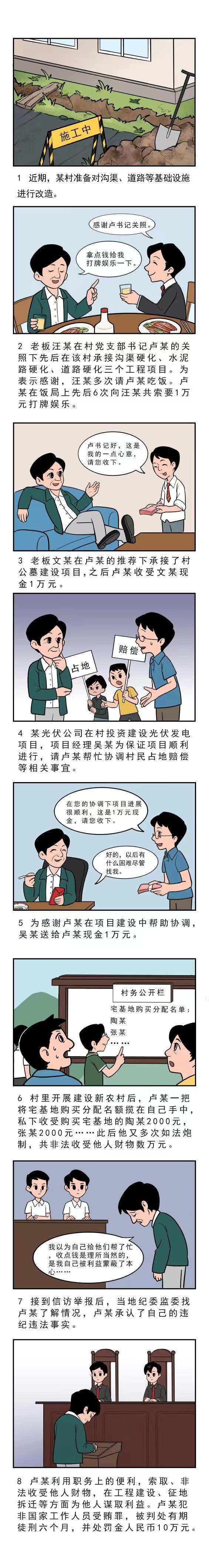 盧某,中共黨員,某村原黨支部書記、村主任。2006年至2017年,汪某在盧某的關(guān)照下先后在該村承接溝渠硬化、水泥路硬化、道路硬化三個(gè)工程項(xiàng)目。為表示感謝,汪某多次請盧某吃飯。盧某在飯局上先后6次向汪某共索要1萬元打牌娛樂。2013年,文某在盧某的推薦下承接了村公墓建設(shè)項(xiàng)目,之后盧某收受文某所送現(xiàn)金1萬元。2017年,某光伏公司在村投資建設(shè)光伏發(fā)電項(xiàng)目,項(xiàng)目經(jīng)理吳某為保證項(xiàng)目順利進(jìn)行,請盧某幫忙協(xié)調(diào)村民占地賠償?shù)认嚓P(guān)事宜,后項(xiàng)目在盧某的協(xié)調(diào)下順利進(jìn)行。2018年年初,為感謝盧某在項(xiàng)目建設(shè)中幫助協(xié)調(diào),吳某在項(xiàng)目指揮部辦公室送給盧某現(xiàn)金1萬元。